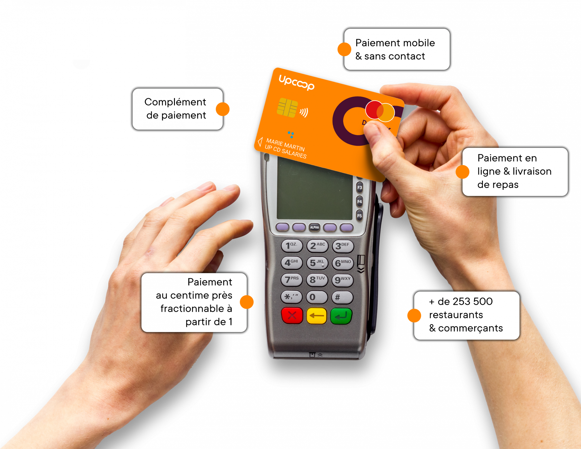 La carte déjeuner Upcoop révolutionne le paiement des repas. Fonctionnant comme une carte de paiement classique, elle est acceptée à travers notre réseau de 253 500 commerçants et chez nos partenaires traiteur ou de livraison à domicile, tels que Foodles, Refectory ou Class’Croute. C’est un moyen de paiement rapide et plus facile d’utilisation.